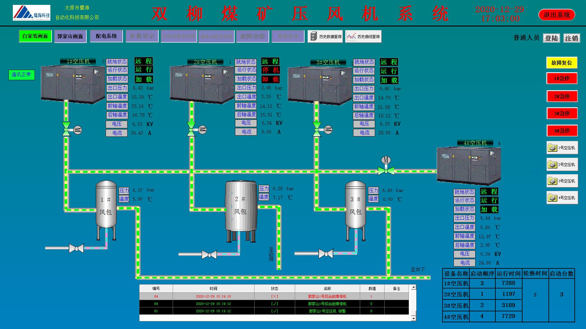 實現(xiàn)壓風(fēng)機(jī)方各重要設(shè)備運行狀態(tài)實時監(jiān)測、故障報警與聯(lián)動控制